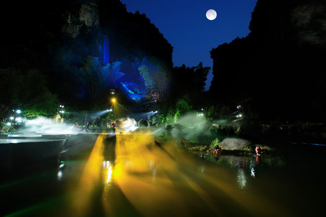 The Ancient Mystical Legend of Zhangjiajie 《武陵魂•梯瑪神歌》是一場記述土家族起源、演變、戰(zhàn)爭、生產(chǎn)生活等內(nèi)容的大型立體山水實景演出,揉合了音樂、舞蹈、文學等多種藝術(shù)形式,如幻如夢的舞美燈光,搖曳生姿的原生態(tài)歌舞……濃縮了土家族數(shù)千年的發(fā)展歷史,400多名演員以自然淳樸的表演充分的展示了土家的民族文化特征,給游客帶來了耳目一新的感受。一場視聽的饕餮盛宴,一曲驚天地、泣鬼神的曠世古歌,給人山水文化光影視聽的享受。【出品:張家界梯瑪神歌文化傳播有限公司】