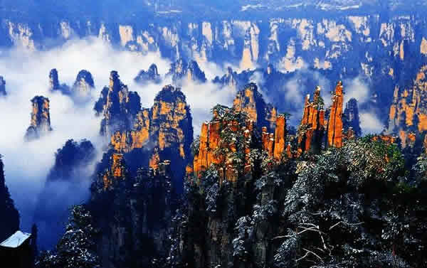 御筆峰 御筆峰被公認為是武陵源砂巖大峰林風(fēng)光的標志景點,不斷出現(xiàn)在海內(nèi)外各種媒體和宣傳品上面,堪稱天下一絕。本來,這是大自然鬼斧神工的神來之筆,科學(xué)上講是歲月風(fēng)化、浸蝕、切[1]削的結(jié)果,但民間卻把它與向王天子聯(lián)系在一起,說是向王天子殉難后,他的御筆化成石峰,廝守在神堂灣邊;而裝御筆的“簽筒”、“筆架”則留在水繞四門。然而,千古興亡,時代更迭,“古今多少事,都付笑淡中”。只有這支“御筆”還在!在詩人眼中,好用它來寫瀟瀟灑灑的霧,寫多姿多彩的云,寫火一般熱烈的朝霞,寫夢幻般純潔的月光,寫“高處不勝寒”的冰雪世界。當(dāng)然,也可以寫您熱戀這方山水或者熱戀某位紅顏知己的情詩。