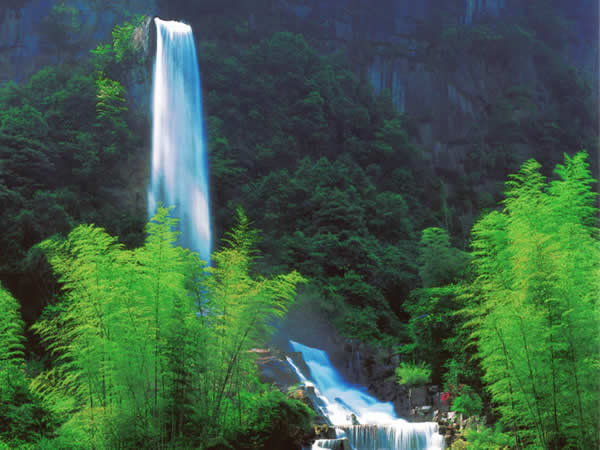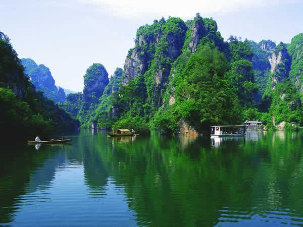寶峰湖瀑布 湖中有兩座疊翠小島,近岸奇峰屹立,峰回水轉(zhuǎn)。泛舟漫游,只見一湖綠水半湖倒影,充滿詩情畫意!霸铺萑f丈上天臺,高峽平湖一鑒開,王母瑤池金扶,浣沙仙女下凡來”游寶峰湖,你就會(huì)欣賞到這樣的詩情畫意。群峰擁抱的寶峰湖,長約2.,5公里,湖猶如一面寶鏡,四面青山,一泓碧水,蕩槳溫游,格外愜意。坐在船上,環(huán)顧四周,千山聳翠,俯視水中,倒影慢移,碧水照相館得群峰綠,人面桃花水映紅。真是靜極了,美極了!韓劇《九天洞》拍攝的湖水就是寶峰湖。