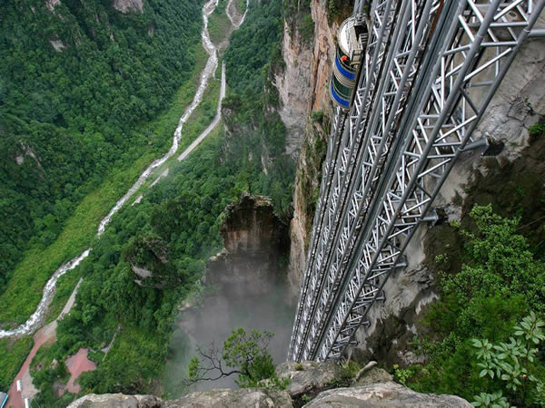 百龍電梯位于世界自然遺產(chǎn)張家界武陵源風(fēng)景區(qū)。工程分布在4.5公里,垂直高差385米的核心景區(qū)。電梯運(yùn)行高度326米,主體由154米山體豎井和172米貼山鋼結(jié)構(gòu)井架等組成,采用三臺雙層全暴露觀光電梯并列分體運(yùn)行。是連通森林公園、金鞭溪、水繞四門到袁家界、烏龍寨、天子山的重要觀光交通設(shè)施。百龍?zhí)焯莨こ毯陚ァ⒐に噺?fù)雜,施工驚險,堪稱“世界工程奇觀”。它的建成創(chuàng)造了三項(xiàng)基尼斯世界紀(jì)錄。