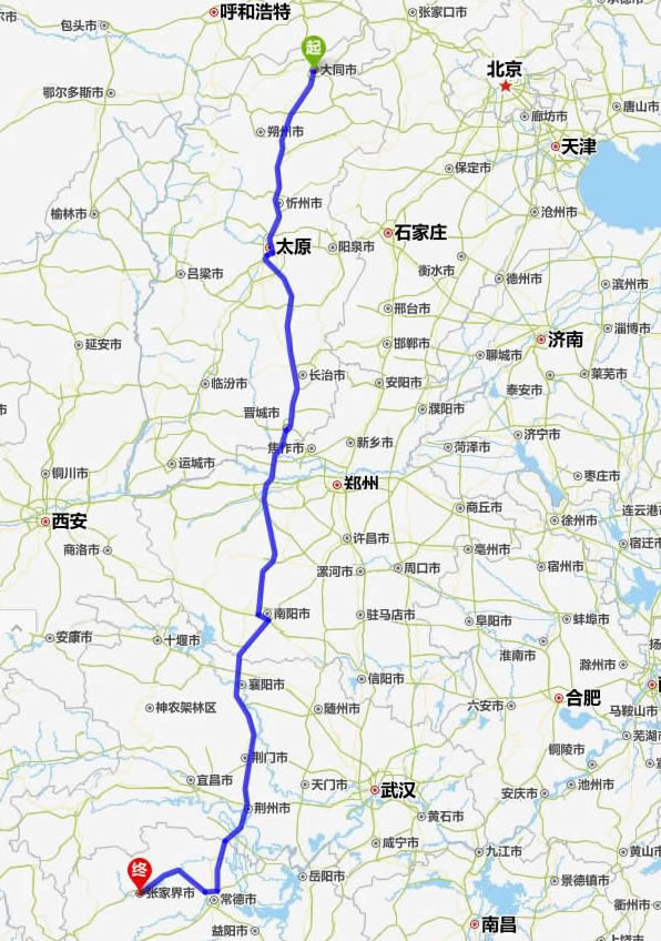 大同去張家界自駕車(chē)自助游線(xiàn)路圖全程高速):