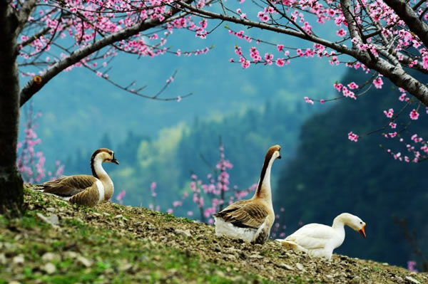 桃之夭夭,灼灼其華。據(jù)了解,天子山這處桃花仙境位于神堂灣至大觀臺(tái)之間的一農(nóng)場(chǎng)山丘內(nèi),面積足有一百畝以上。由于該地段剛好處于天子山至高點(diǎn),因此極目遠(yuǎn)眺,峰林風(fēng)光、桃花美景盡收眼底。而盡管農(nóng)場(chǎng),則是一派鄉(xiāng)村田園風(fēng)情,一群雞鴨鵝不時(shí)穿梭在桃樹林內(nèi),一邊尋覓食物,一邊享受春光;看家護(hù)院的小黃狗迎接游客的熱情叫聲,讓人頓生回歸鄉(xiāng)愁之感。