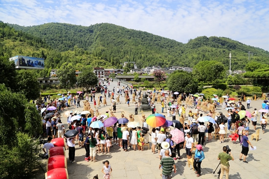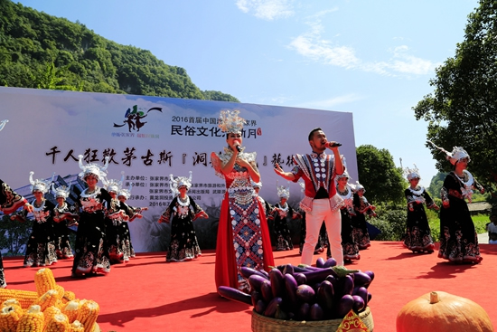 7月29日上午9點(diǎn)30分,由張家界市人民政府主辦,張家界市委宣傳部、市旅游和外事僑務(wù)委員會(huì)、市文體廣電新聞出版局、武陵源區(qū)人民政府承辦,黃龍洞景區(qū)協(xié)辦的“絕版張家界,最炫民族風(fēng)”張家界民俗活動(dòng)月第三場(chǎng)活動(dòng)在黃龍洞景區(qū)啟動(dòng),F(xiàn)場(chǎng)以土家人慶祝豐收的鼓舞拉開序幕,土家鼓舞歡悅的節(jié)奏,夸張的舞姿開場(chǎng)就吸引了幾千游人和當(dāng)?shù)厝擞^看。草根夫妻檔歌手,張家界“山水組合許勇、舒維亮麗的服飾,野性的嗓音……”以一首《我在高山唱》歌曲,征服現(xiàn)場(chǎng)游客,贏得雷鳴般的叫好聲。